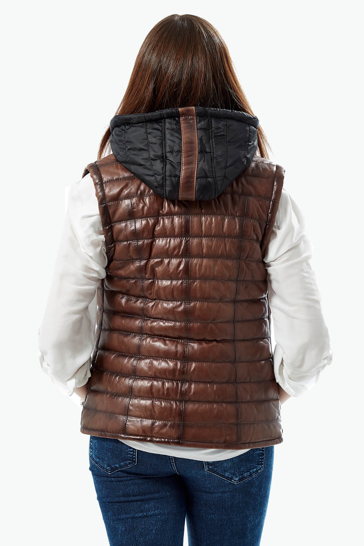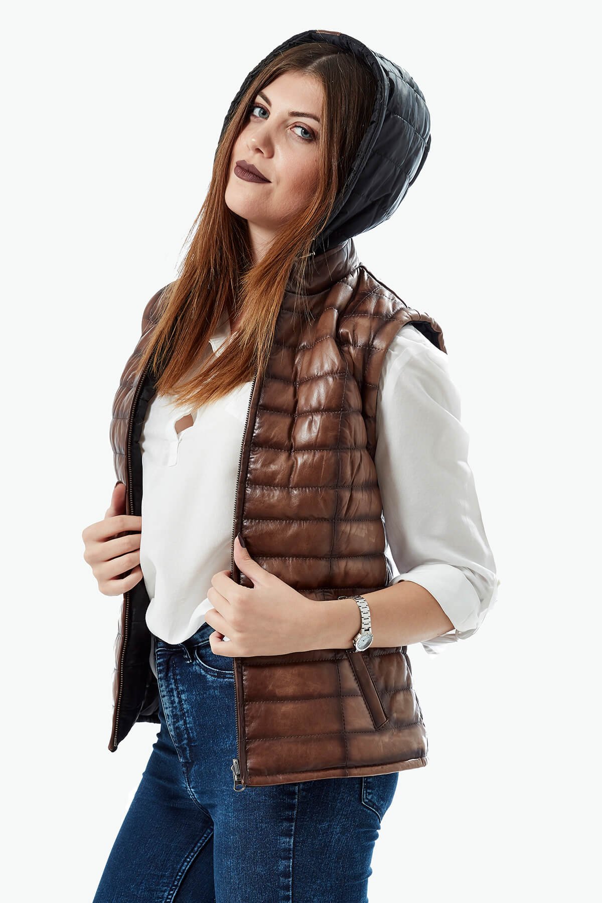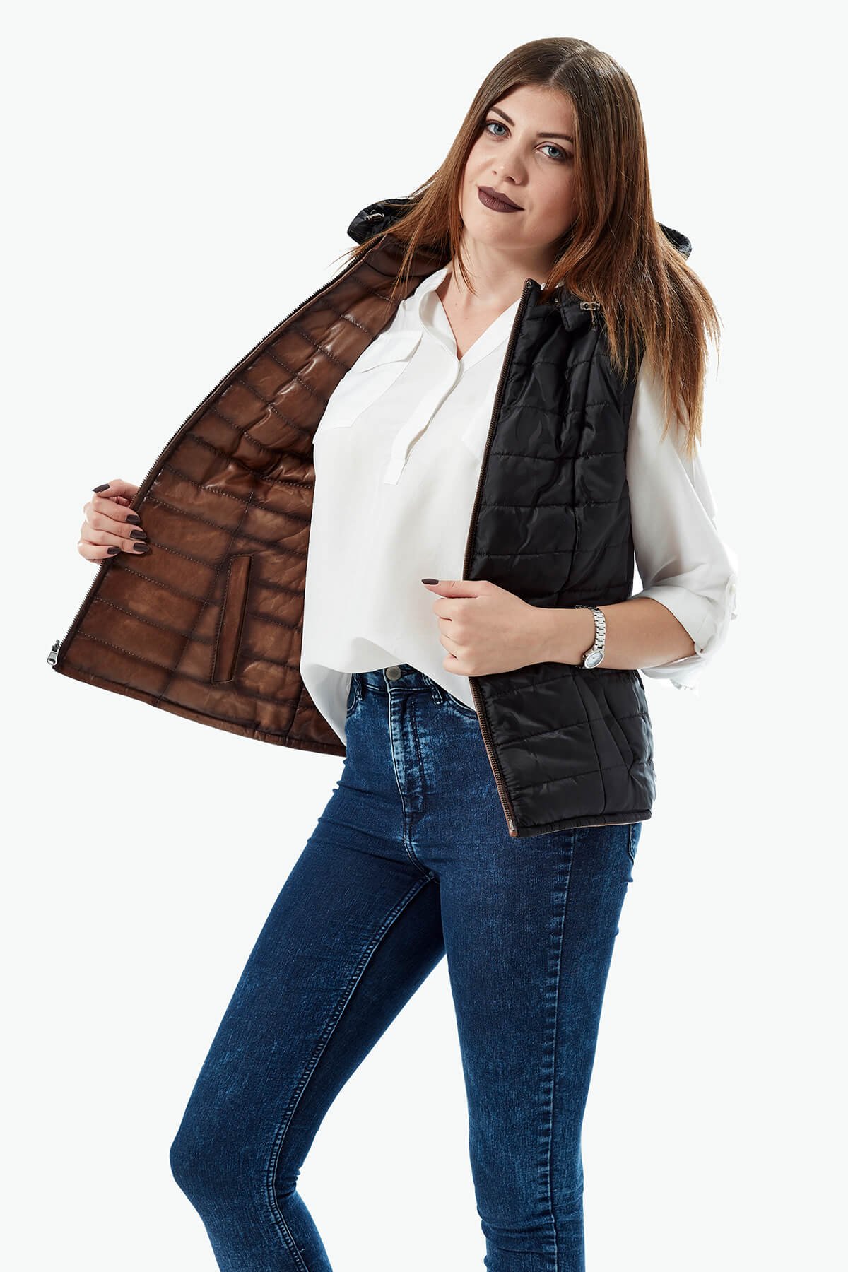 - Çift Taraflı Hakiki Deri Kadın Şişme Yelek – Kahve / Siyah