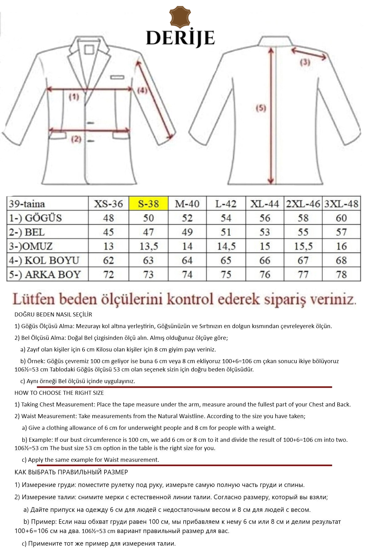 Model Ölçüleri: Boy:1,77 cm Göğüs: 90 cm Bel: 62 cm Basen: 94 cm Model üzerindeki beden "M"Deri Ceket Bakım Öneriler- Bütün ürünler yüksek kalite hakiki deriden el işçiliği ile özenle üretilir ve DERİJE garantisi kapsamındadır.