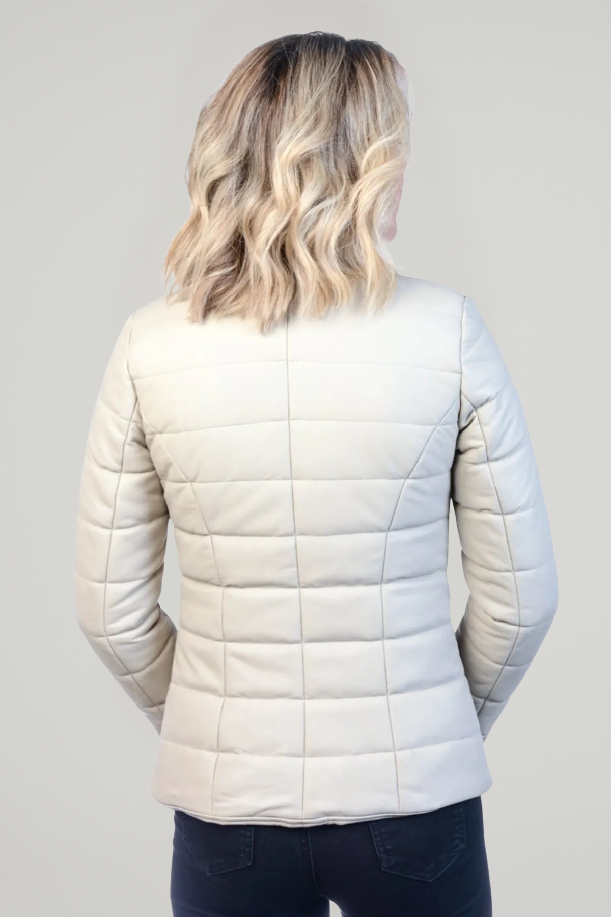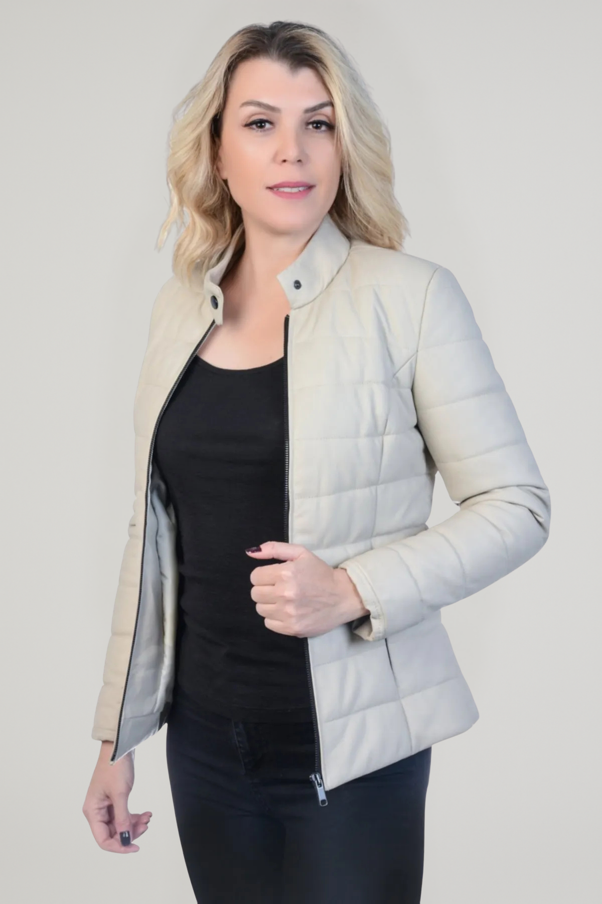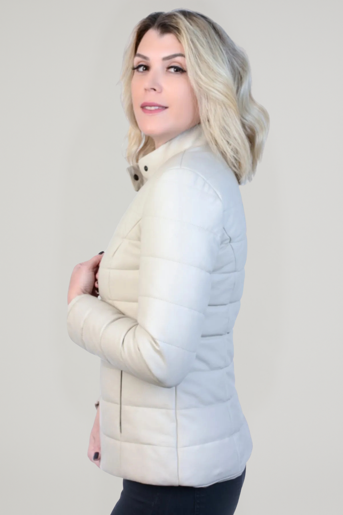 Derije Hakiki Deri Kadın Ekru Şişme Ceket