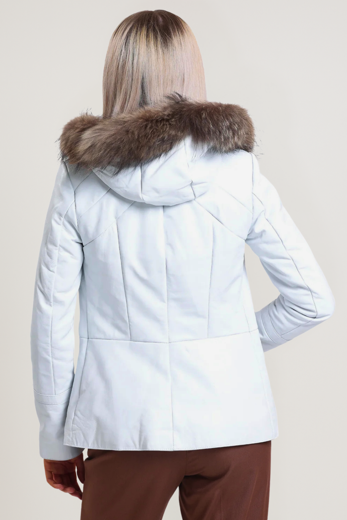 Derije Hakiki Deri Kadın Beyaz Mont – Slim Fit, Taş Detaylı, Kürklü Kapüşonlu